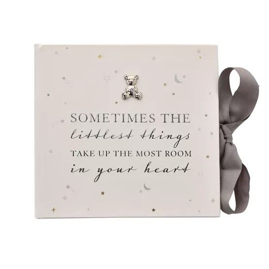 The album features a white cover, complete with glittery star decoration, ‘Sometimes the Littlest Things’ decal in silver foil lettering and silver plated teddy icon with clear set crystal. Inside is space for fifty photographs, personalised front page and luxury grey grosgrain ribbon for closing the album.