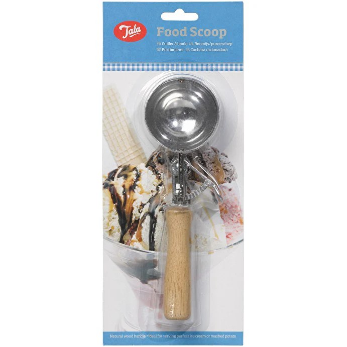 Effortlessly scoop ice cream with this sturdy wooden handle food scoop. It is ideal for serving perfect ice cream measuring out ingredients mashed potato or scooping cake mixture into paper cases. The scoop includes a lever for an easy release.
