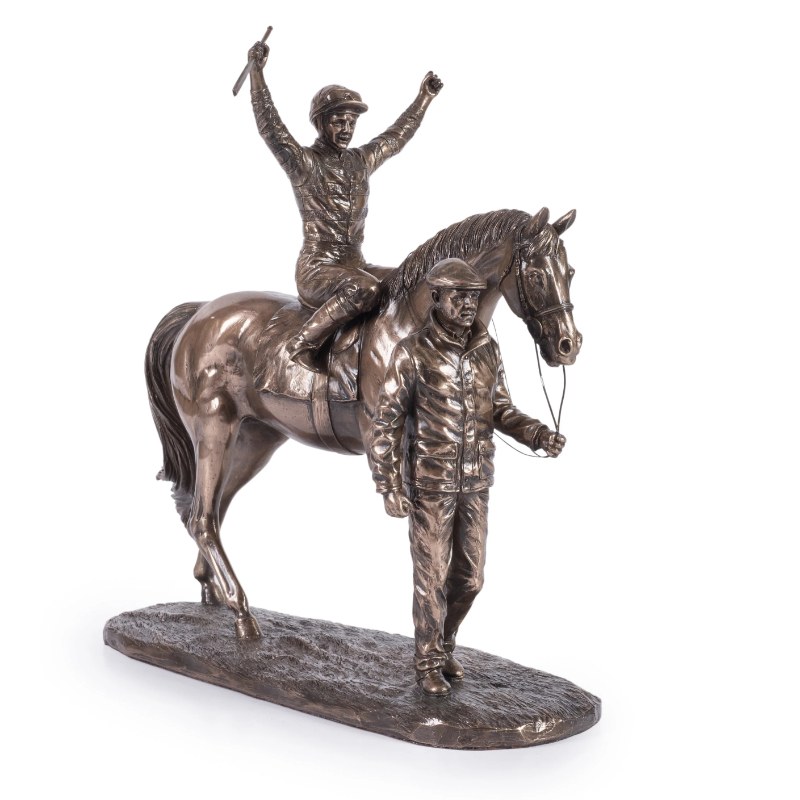 Capture the thrill of triumph with this dynamic sculpture featuring a jockey celebrating victory atop a proud racehorse, led by a steady handler.