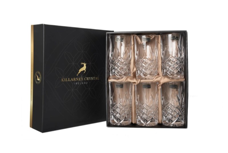 Set of 6 Hi-Ball glasses from Killarney Crystal in a beautiful satin-lined presentation gift box. Each glass has been individually crafted from crystal with a fabulous shine and sparkle. Each glass features a traditional cut glass pattern. This set of glasses are a lovely gift idea.