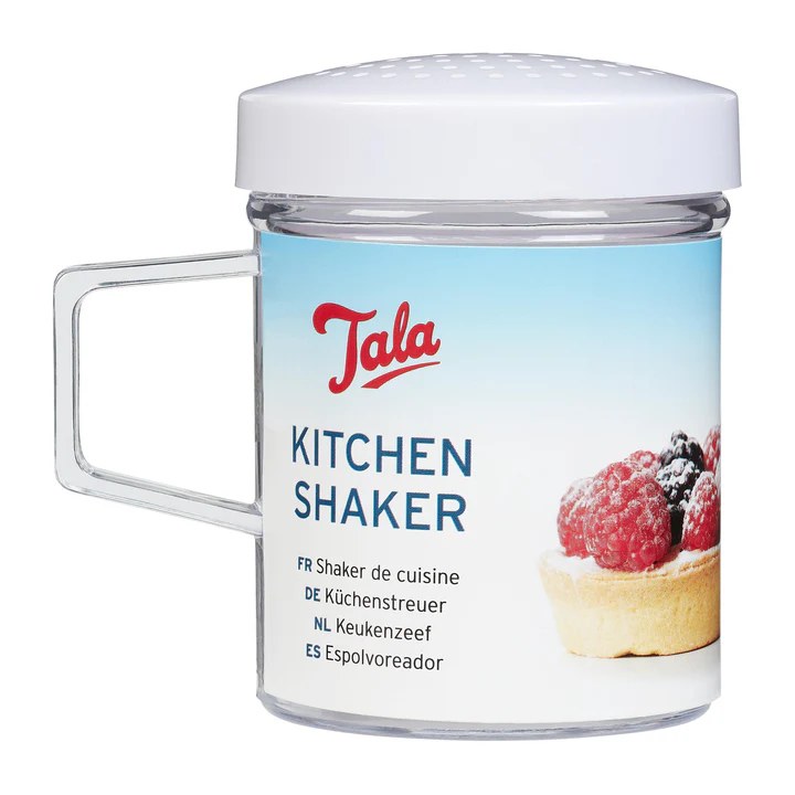 The Tala Kitchen Shaker is ideal for dusting sieving and storing flouricing sugar and cocoa powder. The plastic shaker features a side handle andscrew top for quick and easy use.