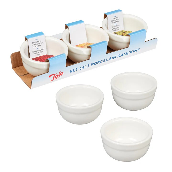The Tala Set Of 3 Mini Porcelain Ramekins are ideal for making individual soufflés deserts gratinated dishes and puddings. These ramekins are also great for serving nibbles at dinner parties or events. Our ramekins are microwave dishwasher fridge and freezer safe.
