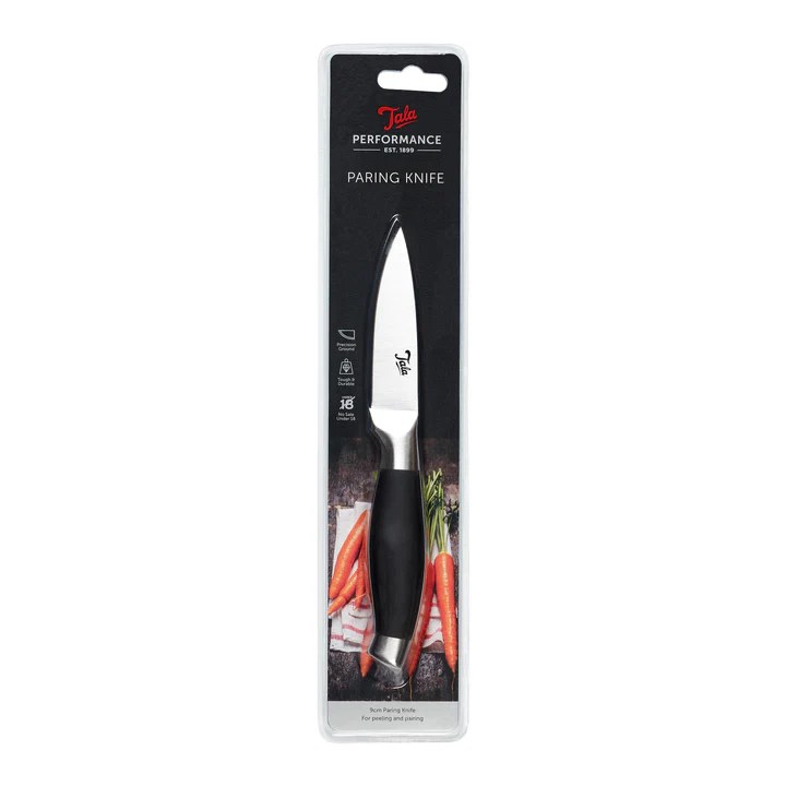 The 9cm Tala Paring Knife adds precision and comfort to the kitchen. Features a superior steel manganese infused blade for maximum durability. Includes soft non-slip grip handle for superior comfort and a safe secure hold for intricate tasks.